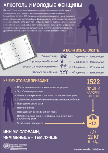 Всемирная организация здравоохранения опубликовала очередной доклад о состоянии здоровья человечества. В этом докладе приведены сведения об основных параметрах, по которым можно определить здоровье той или иной страны, а также данные о факторах, вредящих здоровью. Европейцев этот доклад не порадовал. Немецкий Der Tagesspiegel даже выпустил статью с кричащим заголовком: «Европейцы – чемпионы мира по курению и выпивке». По лишнему весу европейцы вплотную приблизились к стране потных жирдяев – США. Но я остановлюсь только на одном пункте доклада, наверное, самом злободневном для нас – на употреблении алкоголя. Тем более, что накануне в Государственную Думу был внесён законопроект, согласно которому, если он будет принят, купить алкогольные напитки можно будет только людям старше 21 года. Сейчас алкоголь можно покупать с 18 лет. На этот счёт нашлись возражения у депутата Сергея Калашникова. Он напомнил, что в армию у нас призывают с 18 лет, и возмутился тем, что в 18 лет человеку дают оружие, а водку он купить не может. Но ведь правильно же! Армии нужны здоровые и трезвые солдаты, у которых глаз не косит и руки не дрожат после «вчерашнего». Про девушек, которые в армии не служат, Калашников почему-то не вспомнил. А между тем, на сайте ВОЗ специально сделали инфографику, рассказывающую о последствиях употребления алкоголя в нежном возрасте.