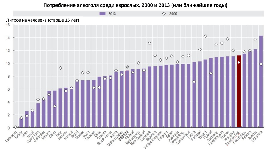 Газета The Independent сообщила, что самой пьющей страной в мире стала Литва. Дальше идут Австрия, Эстония и Чехия. Россия замыкает скорбную пятёрку лидеров. Насколько можно доверять этому исследованию? Сложный вопрос. С одной стороны, на графике чётко видно, что в 2000 году в России потребляли 10 литров алкоголя на душу населения в год, а в 2013 году эта цифра выросла до 11 литров. Вместе с тем вполне очевидно, что пить в России за последние 15 лет стали меньше — рюмочные закрываются, на месте закрытых рюмочных открываются спортивные клубы. Такое расхождение цифр с реальностью объясняется тем, что за эти годы «левой» водки в магазинах стало меньше, а легальной, наоборот, больше. Статистика официальных продаж растёт: Заболеваемость алкоголизмом, наоборот, пусть медленно, но всё же снижается: Статистика по другим странам также вызывает серьёзные вопросы. Так, например, в Финляндии пьют довольно много даже по официальным данным, по 9 литров на взрослого человека в год. Однако алкоголь в Финляндии стоит очень дорого, поэтому в «стране тысячи озёр» процветают контрабанда алкоголя и самогоноварение — в статистике это обстоятельство не учтено. Также для полноты картины стоит упомянуть про известную журналистскую ошибку — попытку напрямую поделить производство спирта в России на количество россиян. Так делать нельзя, так как основе спирта делают не только спиртное, но и разнообразную бытовую химию, которую сейчас в России всё же массово не пьют. В общем, до катастрофы нам далеко, и двигаемся мы даже в правильную сторону, в сторону замены алкоголя на менее вредные наркотики типа спорта и компьютерных игр. Однако движение это идёт, на мой взгляд, очень медленно. Лично я считаю правильным резко ужесточить алкогольную политику государства — без размахивания шашкой а-ля Горбачёв, но и без излишних сантиментов. Более конкретно я бы внёс следующие изменения в законодательство: 1. Запрет употребления алкоголя в общественных местах, включая рестораны, кафе, ночные клубы и даже находящиеся вне квартир граждан места проведения свадеб. 2. Запрет на показ по телевидению и в кино кадров употребления алкоголя, если таковые не входят в старые фильмы, представляющие собой художественную ценность. 3. Запрет на показ фильмов, сюжет которых строится исключительно на пьянстве — вроде той же «Иронии судьбы». 4. Запрет на употребление алкоголя на официальных мероприятиях и дипломатических приёмах, а также запрет на употребление алкоголя на праздничных новогодних телепередачах. Большие штрафы юридическим лицам за алкогольные напитки на корпоративах. 5. Запрет на любую рекламу алкоголя, включая рекламу в СМИ, уличную рекламу и рекламу посредством спонсорства. Запрет на продажу алкоголя вне специализированных магазинов и запрет на рекламу этих магазинов. 6. Большой налог на этикетку. Грубо говоря, с бутылки со стандартной надписью «водка» нужно будет заплатить 100 рублей налога, а с бутылки с надписью «водка „Гранёный“» уже 300 рублей налога. 7. Принудительная доставка в вытрезвители пьяных граждан из общественного транспорта и тому подобных мест — даже тех, кто ведёт себя относительно спокойно. 8. Жёсткий запрет на алкогольные шутки в духе «ура, пришла пятница» и «опять тяжёлый похмельный понедельник» — вплоть до отзыва лицензий у радиостанций, ведущие которых не умею