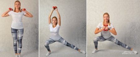 Встаньте прямо, руки согнуты к плечам (можно взять гантели или гимнастическую палку), ноги вместе, живот втяните. Поднимая руки над головой, сделайте шаг в сторону и присядьте. При этом ступня должна стоять параллельно той, которой вы не шагали. Выпрямитесь и шагните обратно, возвращая руки к плечам. Сделайте то же самое в другую сторону.