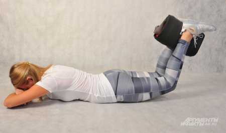 Лягте на живот, голову положите на согнутые руки. Между ступнями зажмите небольшой мяч или большое свёрнутое полотенце. Ноги согните в коленях. Поднимите ноги с зажатым предметом как можно выше, стараясь оторвать от пола колени и бёдра.
