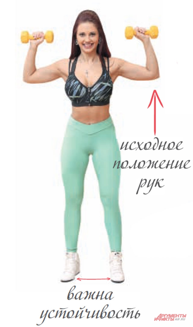 Держите гантели внизу и не спеша разведите руки в стороны, подняв их до линии плеч - как на фото. Вернитесь в исходное положение. В этом упражнении очень важно поднимать и опускать руки медленно. Повторите 15-20 раз, при этом следите, чтобы спина не сутулилась. Благодаря этому упражнению формируется не только красивая грудь, но и вся линия декольте, руки становятся подтянутыми, плечи - красиво очерченными. А благодаря тому, что ноги чуть-чуть согнуты, вы тонизируете мышцы ног и бёдер.