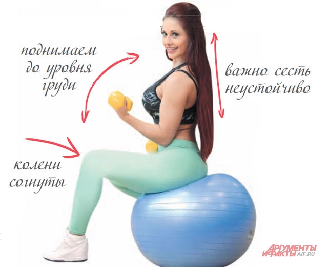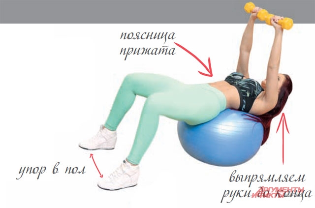 Для этого упражнения идеально использовать гимнастический шар. Если у вас его нет, можете поставить два стула и лечь на них корпусом. Возьмите в руки гантели (или бутылки с водой на крайний случай), поднимите вверх и потом медленно согните руки в локтях и опустите, разведя в стороны. Повторите 15-20 раз.