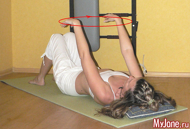 Далее выполните по 4 вращательных движения плечами в каждую сторону. Если занимаетесь, лежа в постели, то тут придется приподняться.