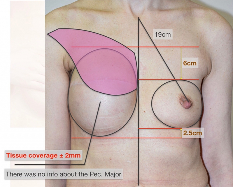 — Казалось бы, все сделано правильно, — рассказывает Михаил Владимирович, — но вот подобранный тканевой экспандер оказался совершенно не соответствующим размеру здоровой груди. Очевидная разница в высоте, ширине, проекции груди была обусловлена именно неправильным подбором экспандера. Кроме того, была полностью разрушена и сглажена складка под грудью (субмаммарная складка), а большая грудная мышца ? отсечена так высоко, что практически не покрывала экспандер спереди. Перерастянутый экспандер послужил причиной истончения кожи, создав риск возможного некроза кожи.