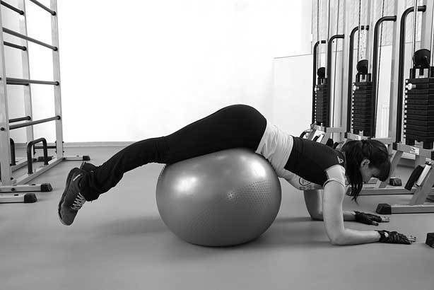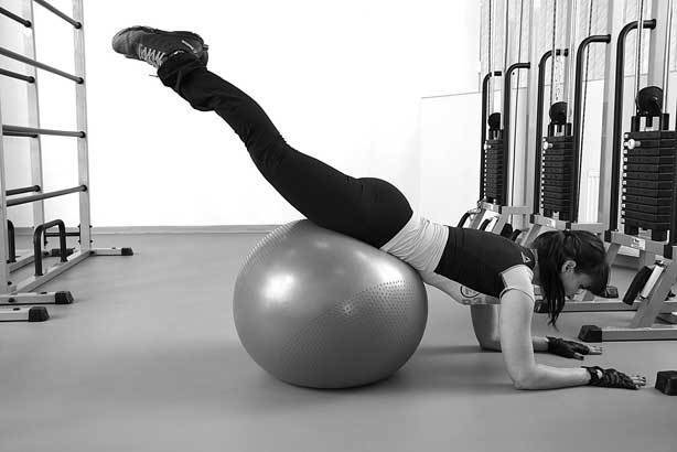 Другой вариант этого упражнения — подъем ног из исходного положения, лежа животом на мяче.