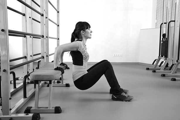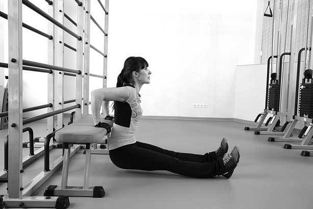 - Сядьте на пол, ноги вытянуты, а руками обопритесь на два стула. На выдохе выпрямите руки, как бы отжавшись от стульев. Вернитесь в исходное положение.