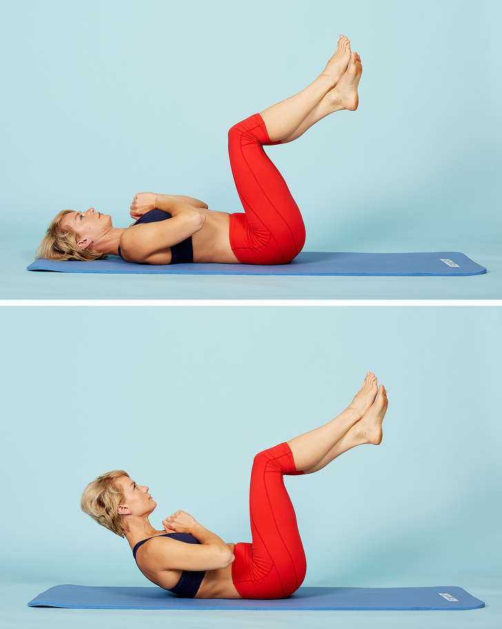 Скрестите лодыжки и поднимите колени под прямым углом. Держите руки у груди и выполняйте подъемы лопаток от пола, напрягая пресс. Выполните 3–5 подходов по 10–15 раз.