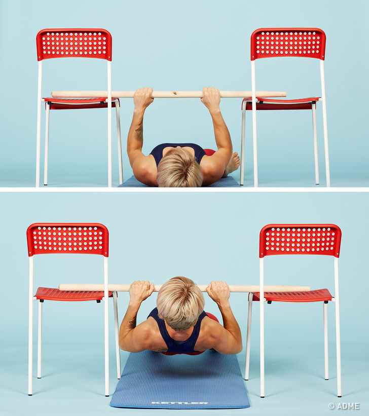 Турник можно соорудить дома из подручных материалов или найти подходящий во дворе. Чем выше перекладина, тем сложнее вам будет выполнять упражнение. Сделайте 3–5 подходов по 10 подтягиваний.