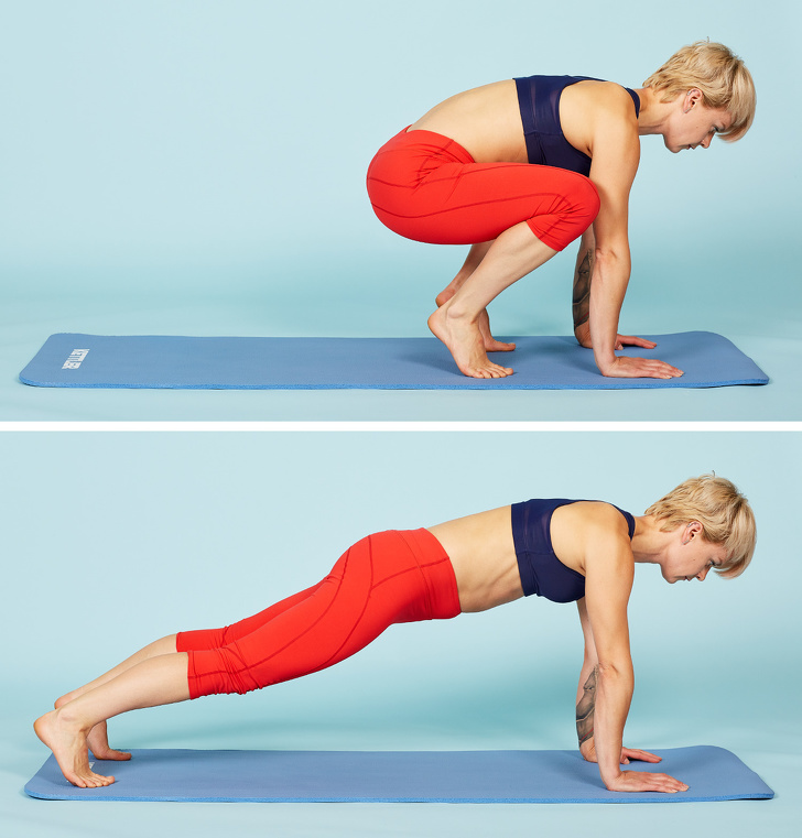 При выполнении этого упражнения не забывайте следить за спиной. При каждом прыжке держите планку хотя бы несколько секунд, а затем снова возвращайтесь в исходное положение. Сделайте 15–20 повторений.