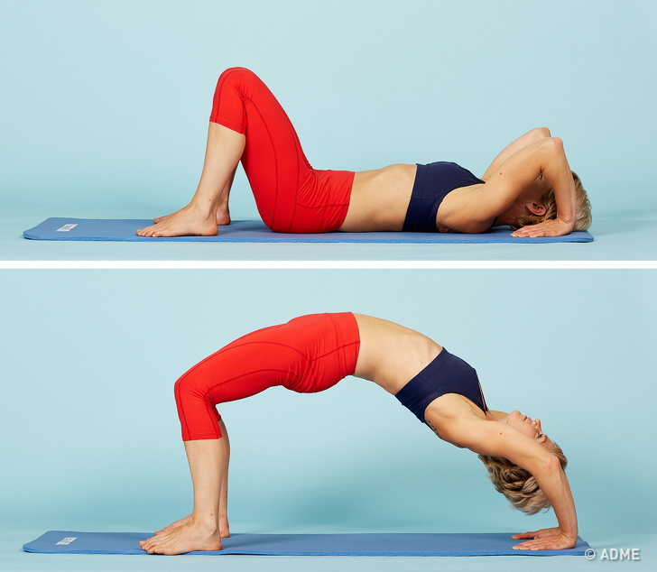 «Мостик» развивает гибкость позвоночника, улучшает координацию и подтягивает все тело. Важно выгибать спину по дуге, а ягодицы должны находиться выше головы и плеч. Выполняйте стойку не более 1–2 минут, аккуратно вернитесь в положение лежа, сделайте небольшой перерыв, а затем повторите еще несколько раз.