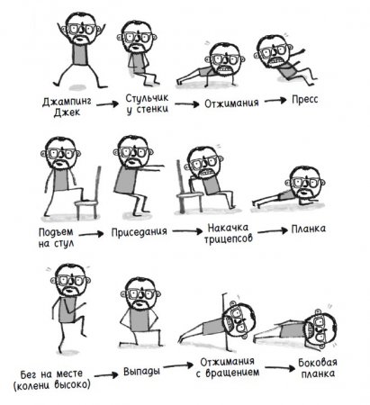 Чтобы не заскучать (или если эти упражнения поначалу кажутся трудными), поэкспериментируйте с разными вариациями. Скажем, отжимайтесь от скамейки, если от пола слишком тяжело. Или постепенно перейдите к приседаниям на одной ноге, если приседать на двух стало слишком легко. В общем, поищите в сети "варианты отжиманий", "варианты приседаний" или "варианты подтягиваний" — их там достаточно.