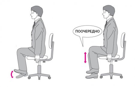 - Сядьте на стул, не прислоняясь к его спинке. Немного приподнимите обе ноги и как бы похлопайте пальцами ног по полу. Затем повращайте ступнями в одну и в другую сторону.