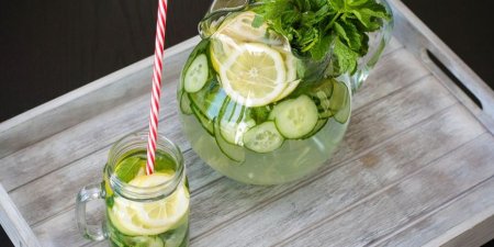 Берем два литра питьевой воды, добавляем в нее 1 лимон, нарезанный кружочками (его можно заменить лимонным соком), 1 очищенный от кожуры свежий огурец – тоже нарезанный кружочками, 10 подробленных руками листиков свежей мяты или 1 чайную ложку сушеной, 1 чайную ложку имбиря. Настаиваем эту смесь целую ночь в непрозрачной посуде на нижней полке холодильника, и выпиваем в течение дня.