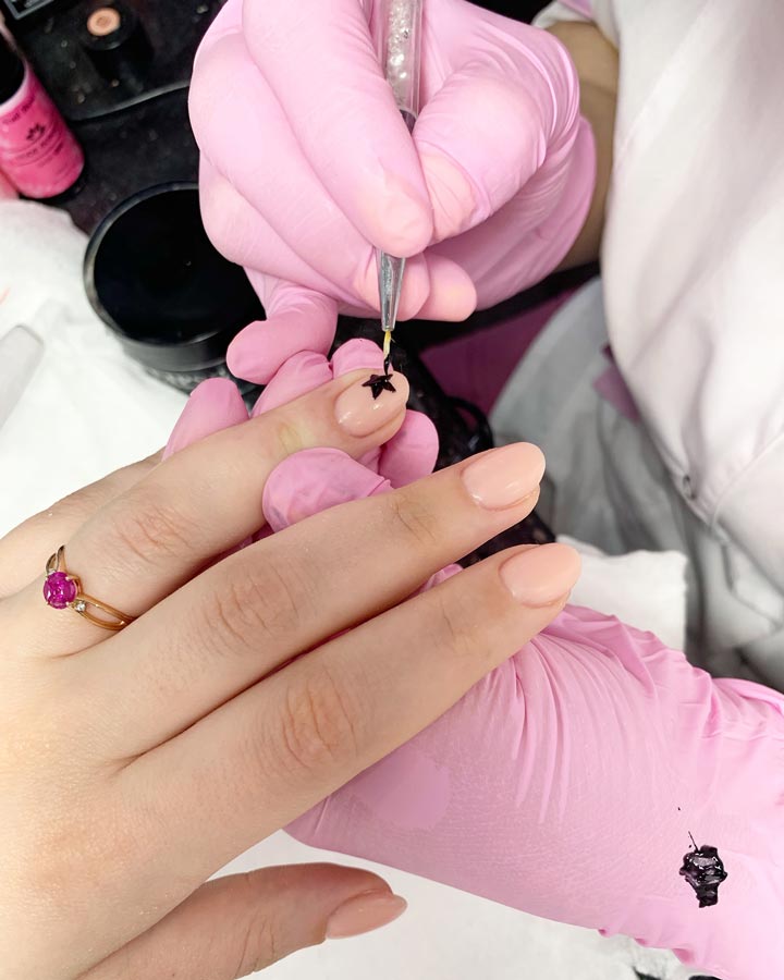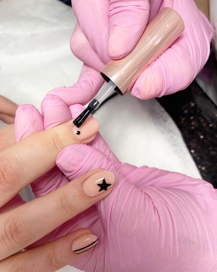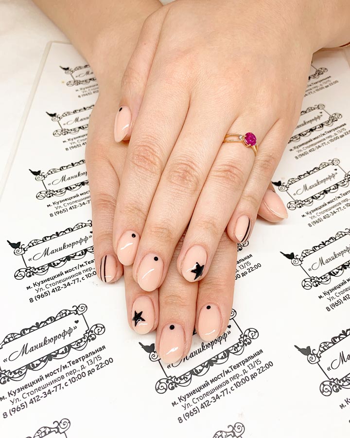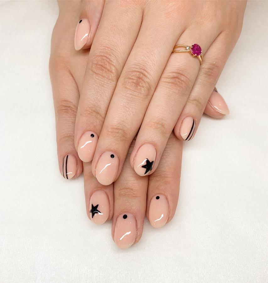 - С помощью тонкой кисти и черного лака рисуем звездочки, ставим точки и проводим вертикальные линии. Готовый дизайн также сушим под УФ-лампой.