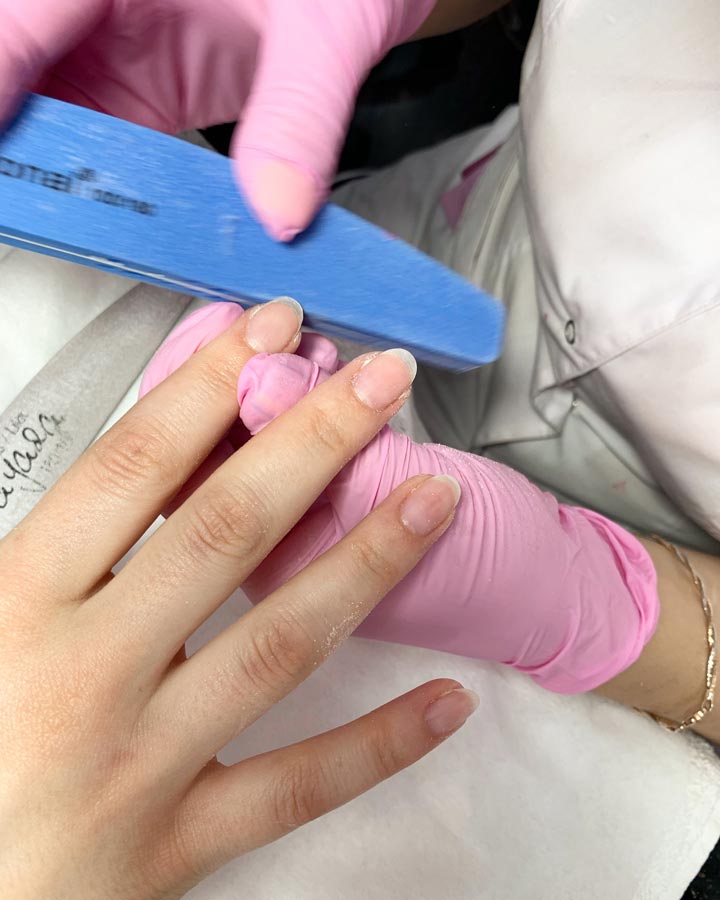 - Придаем ногтю нужную форму с помощью пилочки. Подпиливание выполняем только на сухих ногтях, в противном случае они будут склонны к поломке или расслаиванию. В данном случае мы меняем форму ногтей с мягкого квадрата на овальную.