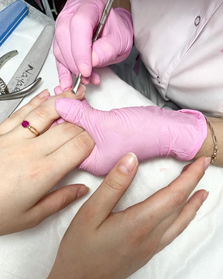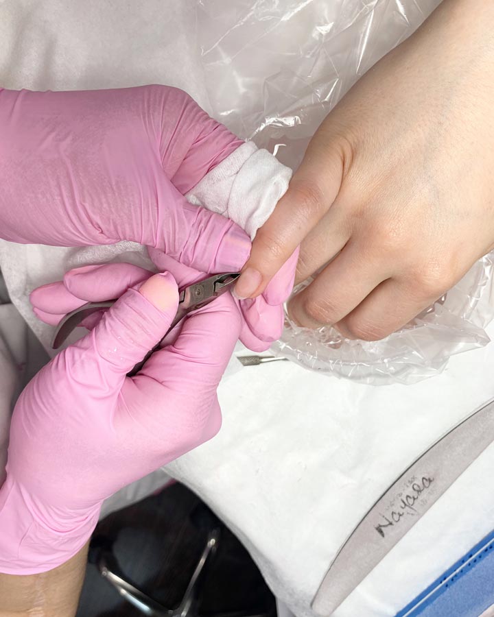 - Теперь кисти рук опускаем в ванночку с теплой мыльной водой. Спустя 5-10 минут приступаем к классическому обрезному маникюру. С помощью металлической лопаточки отодвигаем кутикулу и кусачками обрезаем ее.