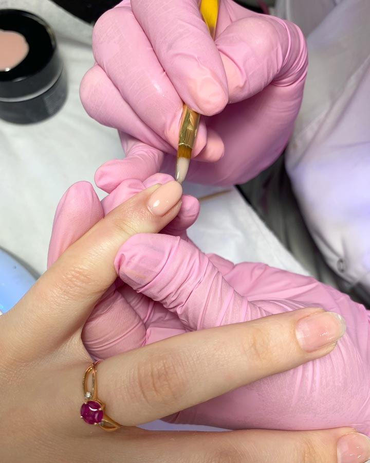 - Переходим к нанесению базовой основы. Для создания нежного нюдового маникюра удобно использовать не прозрачную, а камуфляжную базу. Базовое покрытие наносят для того, чтобы выровнять поверхность ногтевой пластины. Камуфляжная база удобна тем, что она используется одновременно и в качестве лака. Обычно ее выпускают розоватых или светло-бежевых оттенков. После нанесения первого слоя сушим ногти в УФ-лампе, затем наносим второй слой лака или базы и снова отправляем ноготочки сушиться.