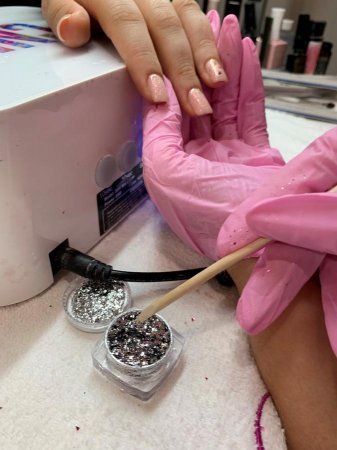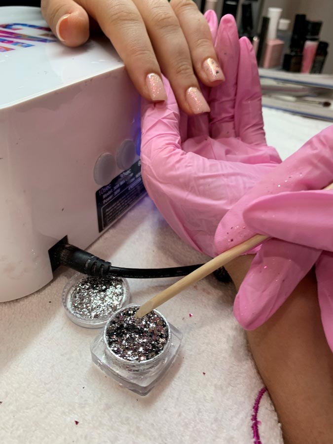 5. Следующий шаг: покрываем ногти прозрачным лаком с блестками. Также сушим в УФ-лампе.