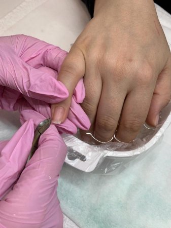 3. Держим кисти рук в ванночке с теплой мыльной водой не менее 5 минут и приступаем к выполнению классического маникюра. С помощью кусачек и лопатки удаляем заусенцы и кутикулу.