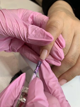 4. Наносим базовый лак для ногтей. В нашем случае использовалась каучуковая база. Она телесного цвета и ложится намного плотнее обычной. С ней дополнительное укрепление ногтя не требуется. Рекомендуется накладывать в два слоя. Каждый слой сушим в УФ-лампе.