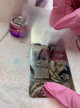 На металлической пластине выгравированы различные рисунки и узоры. Выберите сюжет, который вы хотели бы воспроизвести на ногтях, и при помощи скребка нанесите на него лак. Мы выбрали черный лак и рисунок в виде перышка.