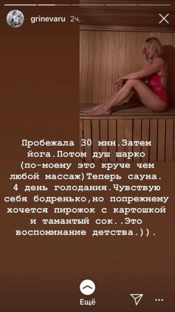 «Я абсолютно уверена, что голодание — это здоровье, а переедание — это болезни и старость. Тело, безусловно, должно получать витамины и есть нужно 5 раз в день, но немного. Полезные продуты. Я за здоровый образ жизни, но как же трудно ему следовать. И как нужно организовывать жизнь. Решила сделать ход конем. Голодание 7 дней. Только вода, ни корочки хлеба Кстати, хлеба очень хочется. Хочется простые божественные продукты: хлеб, свежий огурец Это голодание лечебное, перезагрузка организма. Тут целая наука. Ты под наблюдением врачей и целый день занят: процедуры, массаж, душ Шарко, йога, лекции Попробую бегать, может получится», — поделилась мнением и снимком из сауны Ирина.