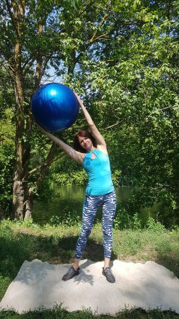 На выдохе наклонитесь вправо, растяните левую половину туловища. На вдохе вернитесь в исходное положение. На следующем выдохе аналогичным образом наклонитесь влево. Для большей эффективности возьмите в руки йогабол.