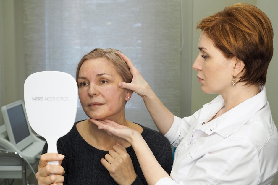 «Перед проведением процедур консультация необходима в обязательном порядке. Специалист определяет состояние кожи и составляет план лечения. У Елены произошло опущение кожи – появилась дряблость вследствие птоза мягких тканей (результат похудения, а также старения кожи). Это является прямым показанием к безоперационной аппаратной подтяжке лица Ultherapy (Альтера-терапии).