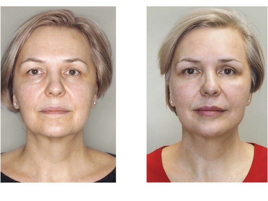 Наша героиня, Елена, раньше весила 98 кг. После ухода с работы у Елены появилось время и возможность. Но главное — появилось желание изменить себя и свою жизнь. «До ухода с работы я ходила намного меньше, думаю, в среднем 4-5 тысяч шагов, а теперь стала проходить по 10 тысяч. Я поняла, что самое полезное, что могу сделать для себя и своего здоровья - это изменить образ жизни и систему питания. Так я начала худеть - примерно по 1 кг в месяц на протяжении года. Потом темп немного снизился, но в общей сложности я похудела на 23 кг за 1,5 года. Я не ставила больших целей, думала, что из-за возраста и менопаузы много сбросить не смогу. А вместе с результатами пришел и азарт. Когда перешла границы, которые сама себе ставила, стало интересно, сколько еще я смогу. В процессе похудения я видела, что кожа начинает подвисать. Раньше я делала простой ручной массаж с маслами, гелями для лица и тела. Уходы в кабинете косметолога. Ничего серьезного или аппаратного. Но сейчас понимала, что этого явно будет недостаточно… И именно в этот момент услышала от друзей об Альтера-терапии и решила попробовать». Консультация врача «Перед проведением процедур консультация необходима в обязательном порядке. Специалист определяет состояние кожи и составляет план лечения. У Елены произошло опущение кожи – появилась дряблость вследствие птоза мягких тканей (результат похудения, а также старения кожи). Это является прямым показанием к безоперационной аппаратной подтяжке лица Ultherapy (Альтера-терапии). Микросфокусированный ультразвук Альтера-терапии проникает в разные слои кожи и стимулирует синтез нового молодого коллагена и эластина без повреждения поверхности кожи лица и не действует на прилежащие ткани. Технология визуализации кожных структур позволяет врачу наблюдать за рабочей зоной и проводить процедуру максимально точно и на необходимой глубине воздействия. Поскольку данная процедура не направлена на возвращение утраченных при похудении объемов лица, для их восполнения пациентке будет вводиться филлер Radiesse (Радиес). Он станет вспомогательным материалом для воссоздания объемной структуры лица. Так же с помощью филлера Belotero Soft (Белотеро Софт) произойдет коррекция мелких морщин в средней трети лица. Введение ботулотоксина Ксеомин скорректирует складки на лбу. Также в качестве ухода всем своим пациентам я назначаю космецевтику Неокутис». Во время процедуры Елена: «Со мной поговорили перед процедурой, все объяснили, рассказали как все будет происходить, предупредили, поэтому страшно не было. У меня никаких болевых ощущений не было. В какие-то моменты мне было даже щекотно. Немного покалывало, но все вполне терпимо, т.е. не хотелось стонать, жмуриться или плакать. После Альтера-терапии было ощущение тепла, как будто мне только что сделали массаж. А инъекции проводились после нанесения обезболивающего крема». Сразу после процедуры Елена: «Когда сделали половину лица мне дали зеркало, чтобы я посмотрела, как все это выглядит и изменения были сразу заметны. То есть одна половина лица, особенно в районе губ очень сильно отличалась от второй половины, где еще Альтера-терапии не было сделано. С одной стороны уголочек губ был опущенный и все вокруг как будто впалое, а с другой стороны все очень здоровое, хорошо выглядящее, уголочек рта ровный. То есть одна стороны выгляде