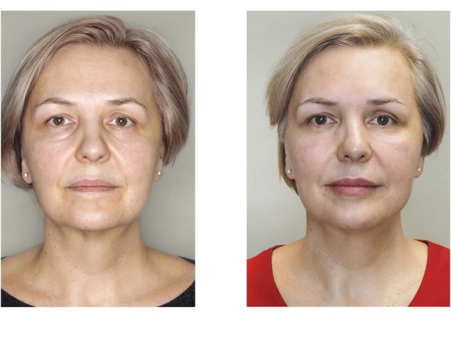 Смягчилась носогубная складка Улучшился овал лица Разгладились морщины на лбуПоднялся уголок ртаПодтянулась кожа под подбородкомПодтянулась средняя треть лицаСмягчилась носослезная бороздаПриподнялась верхняя бровь