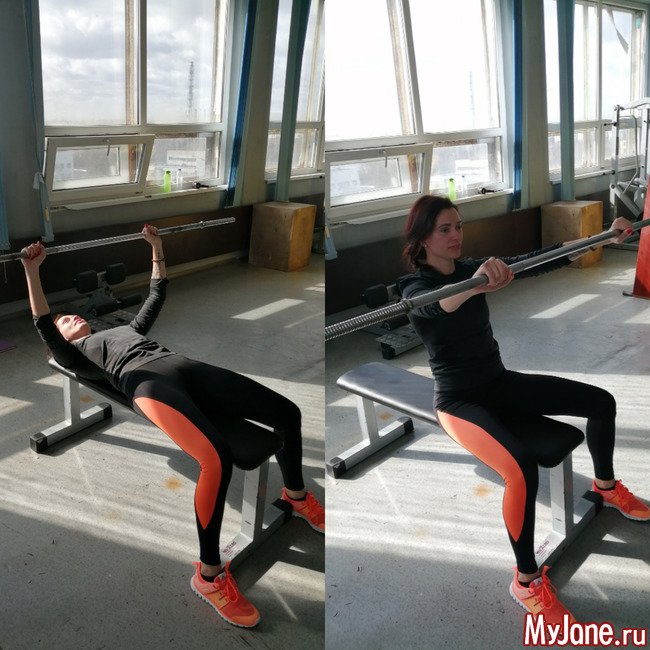 Ложитесь спиной на гимнастический коврик или гимнастическую скамью. Ноги согните в коленях, стопы на полу. Бодибар удерживайте на прямых руках перед собой. Выполните полный подъем корпуса, не меняя положения рук. Возвращайтесь в исходное положение, голову и плечи на пол или скамью не опускайте. Продолжайте в течение 1 минуты поднимать и опускать корпус. Работают руки и прямые брюшные мышцы.