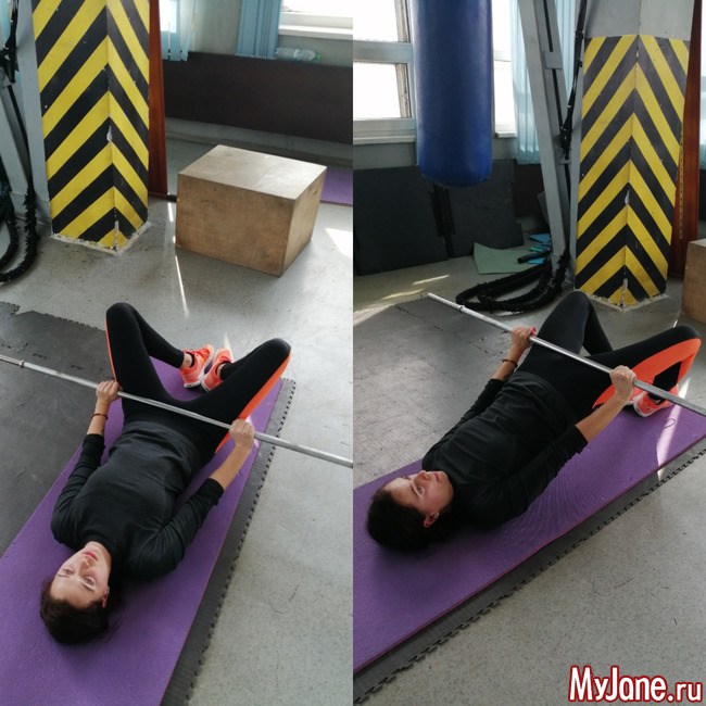 Снова ложитесь на спину. Бодибар обеими руками удерживайте внизу живота. Ноги согните в коленях, раскиньте их в стороны, стопы вместе – так называемая «бабочка». Из него поднимите ягодицы над полом. Зафиксируйте «ягодичный мостик», подняв копчик. Вернитесь в исходное положение. Продолжайте в течение 1 минуты поднимать и опускать ягодицы. Работают ягодичные мышцы.