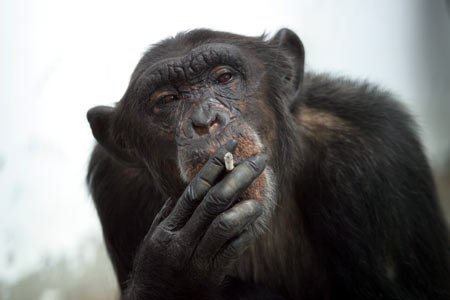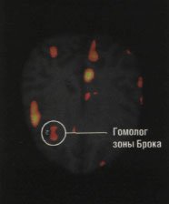 На снимке мозга шимпанзе в процессе жестикуляции показаны наиболее ярко выраженные зоны активности, характерные для каждой из сторон. В том числе это и область в левом полушарии мозга шимпанзе, известная как гомолог (от греч. homos - общий и logos -слово) зоны Брока. У человека зона Брока активизируется во время речи.