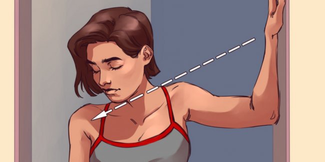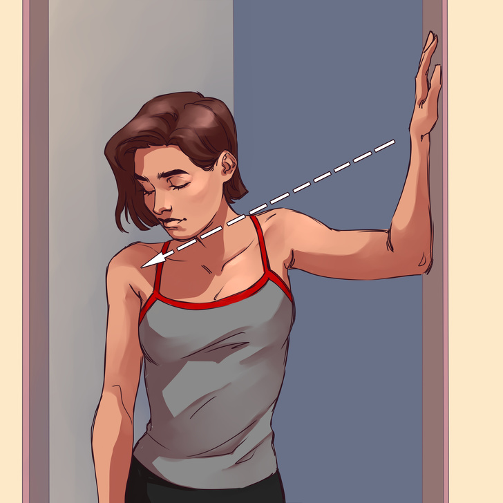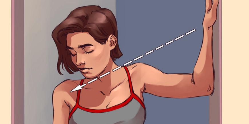 Растяжка шеи и плечевого пояса. Обопритесь одной рукой о дверной косяк, опустите голову и потянитесь подбородком к противоположному плечу. Выполните 10 повторов. Не прилагайте чрезмерных усилий: вы должны чувствовать приятную теплоту в мышцах. Затем повторите упражнение с другой рукой.