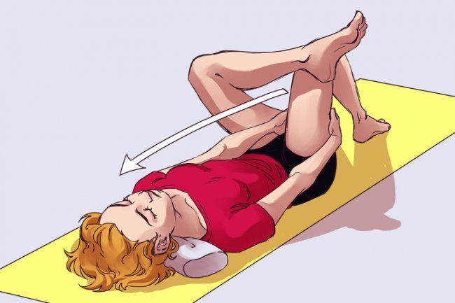 Если поясницу прихватило дома. Лягте на спину, а под голову положите подушку или свернутое полотенце. Согните правую ногу и положите на нее левую. Стопа левой ноги должна свободно лежать на бедре правой.