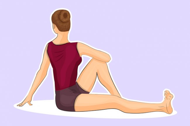 Поворот спины сидя: сядьте на пол и вытяните обе ноги перед собой. Согните левое колено и поставьте на него правый локоть. Упритесь левой рукой в пол позади себя и посмотрите через левое плечо. Задержитесь на 60 секунд, затем смените сторону и повторите.