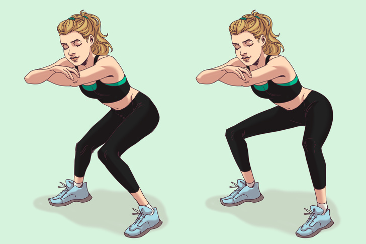 Сделайте присед, ягодицы отведите назад и сведите колени.