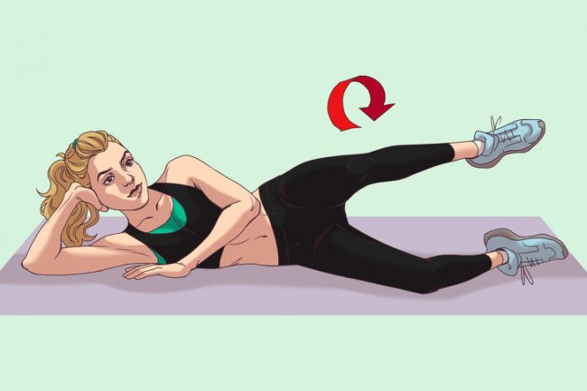 Исходное положение — на боку, колени согнуты. Одну ногу подтяните к груди.