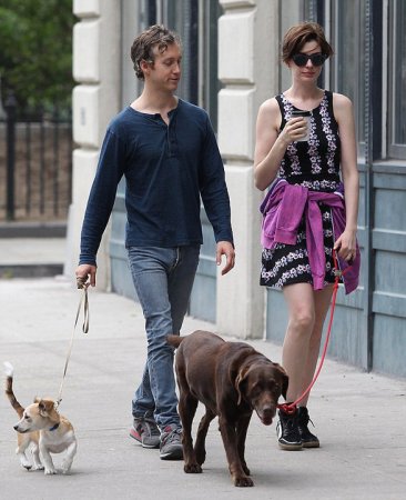 Энн Хэтэуэй с супругом Адамом Шульманом и фаворитами семьи, 2014 год