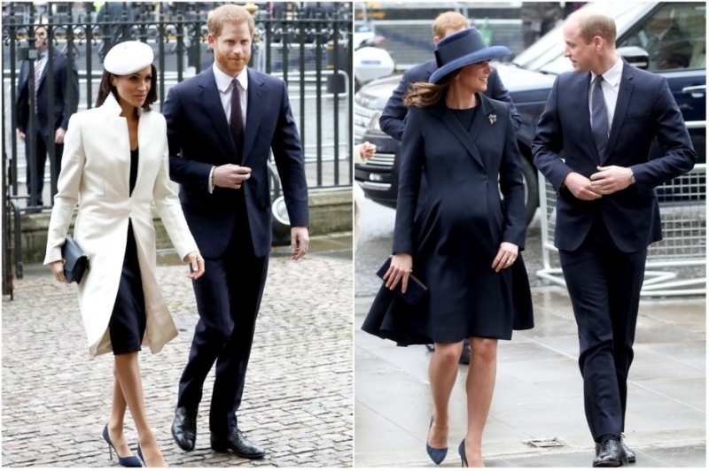 Меган Маркл с принцем Гарри. Кейт Миддлтон с принцем УильямомДля важного выхода Меган выбрала стильное белое пальто Amanda Wakelеу стоимостью $1200 и берет Stephen Jones к нему в тон. Герцогиня Кэтрин появилась на публике в темно-синем пальто Beulah London и шляпке James Lock and Co.