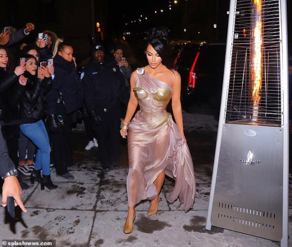 В Канаду, известную своими суровыми зимами, легкомысленная светская львица выбрала эффектный и практически невесомый наряд — прозрачное воздушное платье от Thierry Mugler, под которым было только золотистое боди с корсетом и огромным декольте.