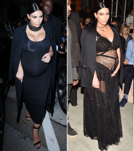 В 2013 году Ким родила первого ребенка — девочку, которую назвали Норт Уэст. Сейчас Кардашьян беременна во второй раз, ожидается, что у нее и Канье Уэста родится мальчик. Ким сильно поправилась во время второй беременности, но это не мешает ей носить обтягивающие платья. Она выставляет напоказ свой внушительный живот и фигуру в целом. «Эй, посмотрите на меня, я беременна!» — безмолвно кричит она, надевая раз за разом тесные платья с внушительными декольте.
