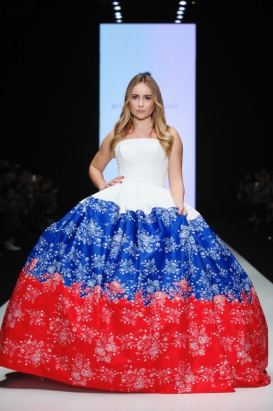 Юная Жулина продефилировала по подиуму в роскошном платье цветов российского флага.