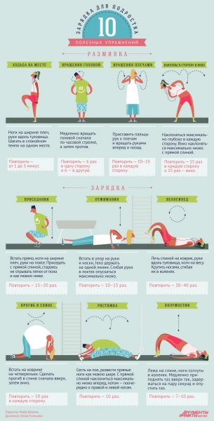 Зарядка — прекрасный способ легко просыпаться по утрам, держать себя в тонусе, мальчики смогут укрепить мускулатуру, а девочки — сохранить красивую фигуруОсобенно полезна зарядка для подростков, чьё тело активно растёт, но при этом они ведут преимущественно сидячий образ жизни. Регулярная посильная физическая нагрузка поможет предупредить множество проблем со здоровьем, избежать болей в спине и формирования неправильной осанки.Мы собрали 10 оптимальных утренних упражнений для подростков, которые помогут быстрее проснуться и укрепить здоровье.