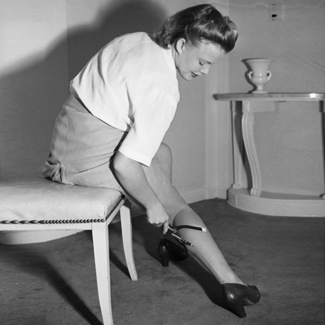Первые чулки возникли на свет в 1939 году, спустя четыре года, как DuPont Corporation представила миру нейлон. Они моментально стали блокбастерами и продавались по 4 миллиона штук в день. Но женское счастье закончилось совместно с пришествием войны: нейлон ушел на создание парашютов, а стоимость на чулки подпрыгнула до 20 баксов на черном базаре. Женщины отправь на отчаянные меры и стали живописать карандашом ровненькие полосы, имитировавшие чулочный шов.
