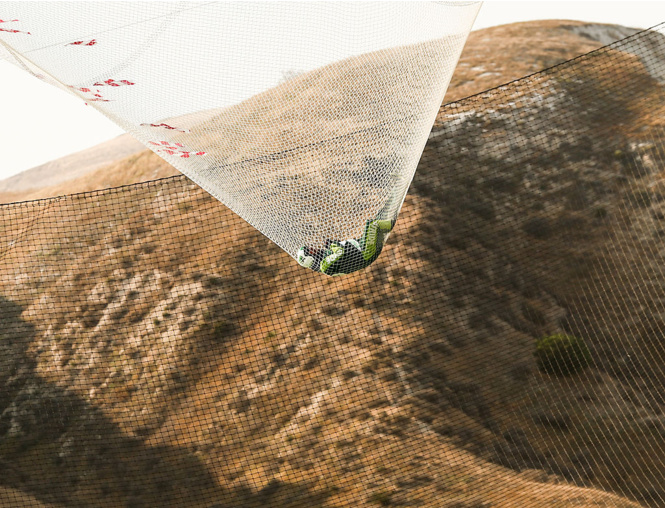 Размеры сетки для приземления — 30 х 30 метров. Она была подвешена на вышине 20 этажей.