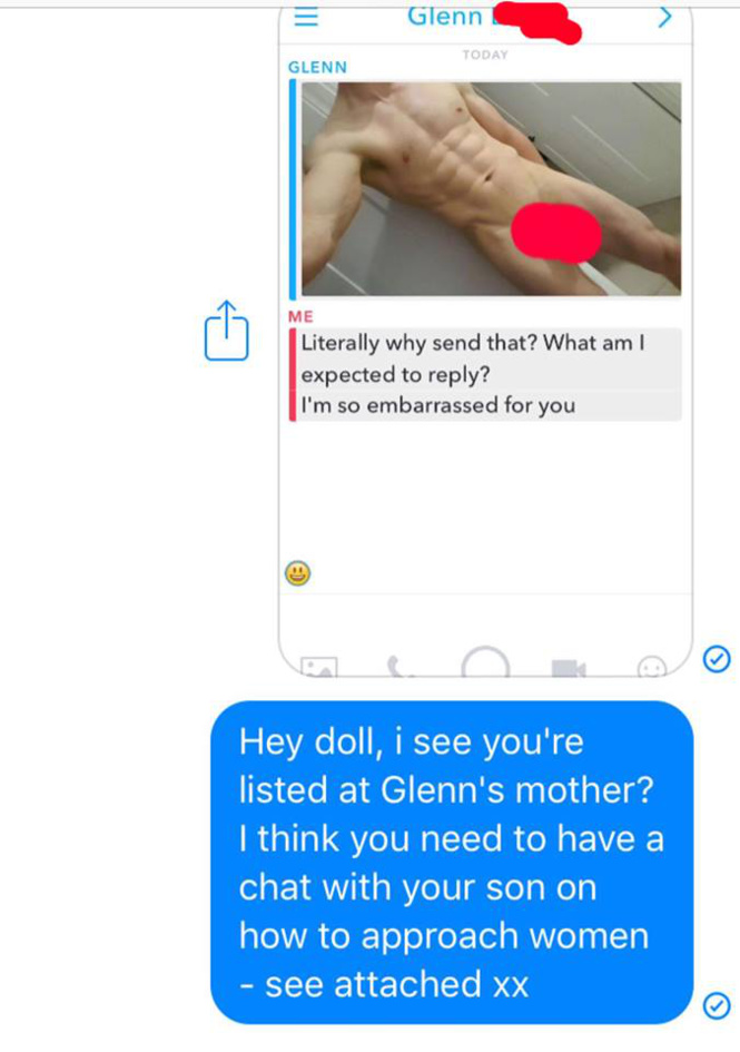 Ребекка снабдила пересылаемое маме фото следующим текстом: «Привет, подруга. Вижу, ты указана как мама Глена. Думаю, тебе нужно поговорить с сыном о том, как общаться с женщинами, — смотри приложение».