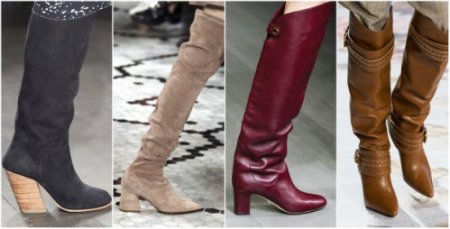 Классические, легко сочетаются с брюками и с платьем, и юбкой любой длины — это сапоги до колена. Этой зимой актуальными будут сапоги до колена, которые не слишком широки и не приталенные к ноге. Что касается каблуков, то преобладают квадратные и не очень высокие варианты.