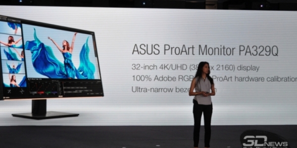 На шоу Computex 2015 ASUS показала новый профессиональный монитор PA329Q для фотографов, моделлеров и художников. Это гигантский монитор с 32-дюймовым экраном, главной особенностью которого является полный охват цветового пространства Adobe RGB.Монитор ASUS PA329Q располагает 16-битной таблицей соответствий и поддерживает цветовое пространство BT2020 / DCI-P3. Данная модель является усовершенствованной версией монитора ProArt PA328Q, показанного ровно год назад, правда, тот мог похвастаться 100-процентным охватом пространства sRGB. Более свежая модель гарантирует поддержку разрешения Ultra HD или 4К, что пригодится не только в работе с фотографиями, но и при просмотре фильмов в ультравысоком качестве. Пока что его стоимость и дата появления в продаже не называются, но известны другие его характеристики.К примеру, на корпусе ASUS PA329Q присутствует трио портов HDMI, два из которых — 1.4, а один — 2.0. недалеко от них расположены DP 1.2 и miniDP, плюс реализована возможность подключения четырех различных устройств к концентратору USB 3.0. Монитор поставляется с подставкой, рассчитанной на регулировку экрана по высоте и углу его наклона к горизонтальной поверхности. Есть также возможность его поворота в портретный режим. Подсветка выполнена на основе светодиодов, и производитель добавил технологии уменьшения доли синего цвета и снижения мерцания изображения.