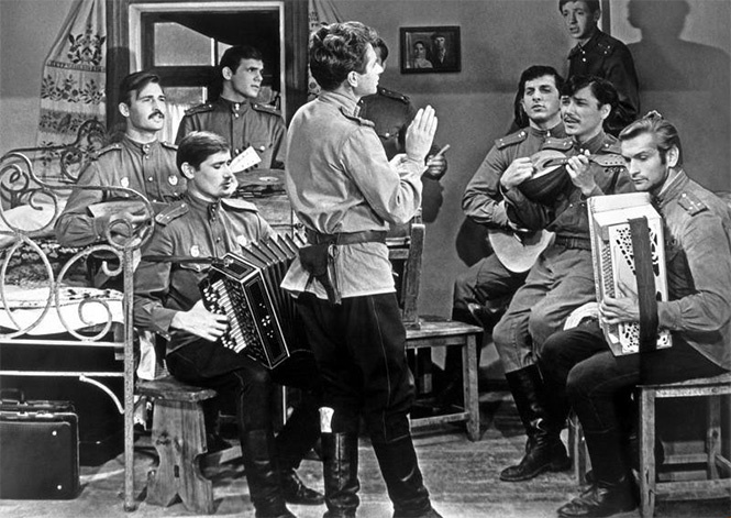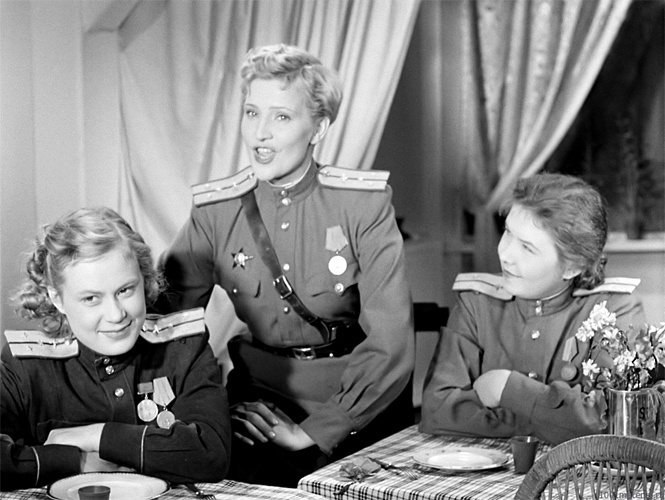 В русских киноцехах в годы войны тоже не спали — клепали патриотические ленты и для тыла, и для фронта. И документальные, и игровые, и нередко с музыкой. Помнишь «Тёмную ночь» Марка Бернеса?Это песня из знаменитой картины «Два бойца» 1943 года. Но самым знаменитым в народе из кинофильмов той эры стал развеселый «Небесный тихоход», вышедший на экраны сходу опосля победы. Праздничная притча о пилоте-асе, которому доверили допотопные летающие этажерки У-2, да еще дамский коллектив в придачу. Фильм подарил стране два духоподъемных гимна: «Первым делом самолеты» и «Пора в путь-дорогу».